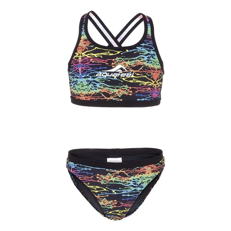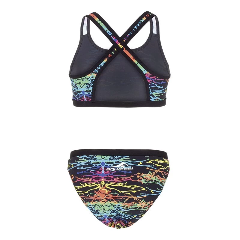 Dieser Mädchen Mini – Crossback – Bikini aus unserer neuen Kollektion Watercolors vereint Stil und Qualität. Der Zweiteiler verfügt über einen innovativen Trainingsrücken mit gekreuzten Doppelträgern, Unterbrustband mit Tunnelzug und Kordel für sicheren Halt. Dieses besondere Modell mit dem energiesprühenden, schwarzgrundigen Gute-Laune-Farbmix ist das Richtige für das nächste Training!