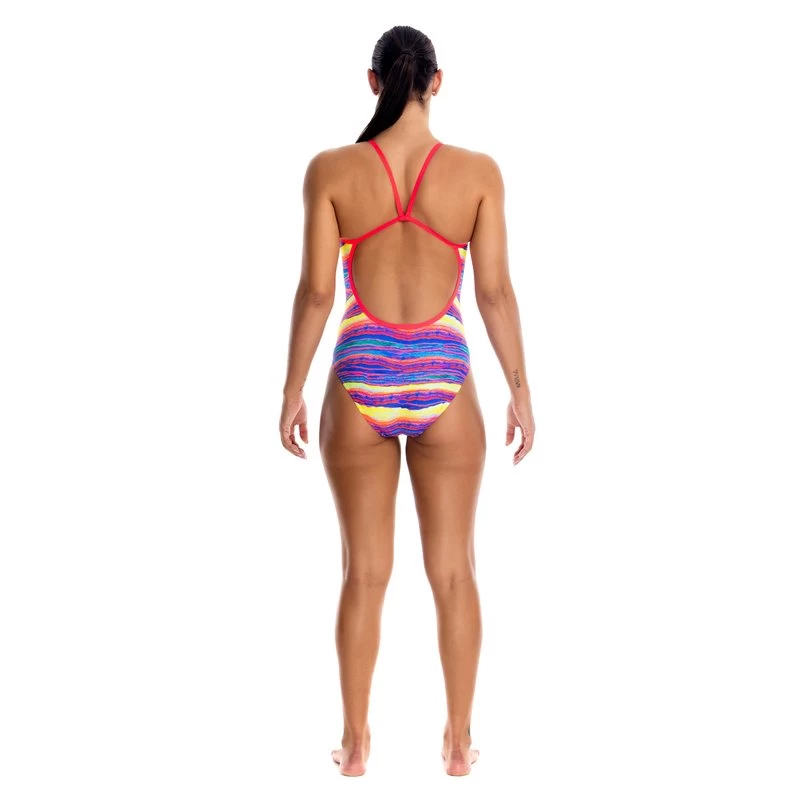 Einteiler mit V-förmigem Rückenausschnitt und schmalen Trägern. Exzellente Strapazierfähigkeit und Bewegungsfreiheit Dank der speziellen Nähtechnik. Mit Paspelierung am Saum als extra Detail. Gesticktes Logo im Rückenbereich.